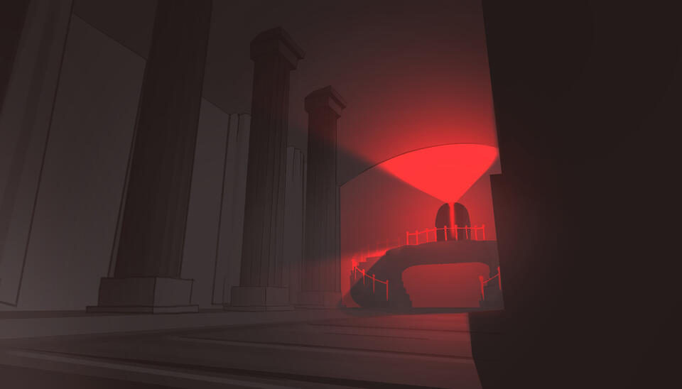 Here, I tackled the main interior backgrounds using a pipeline that started with a 3D model in Maya that I roughly lit and textured. I then brought it into Clip Studio Paint to do a uniform compositing pass that made the backgrounds fit within the aesthetic I wanted.It took a few tries to get to this conclusion, and I ended up making a good number of rougher backgrounds before transitioning to a 3D first method.